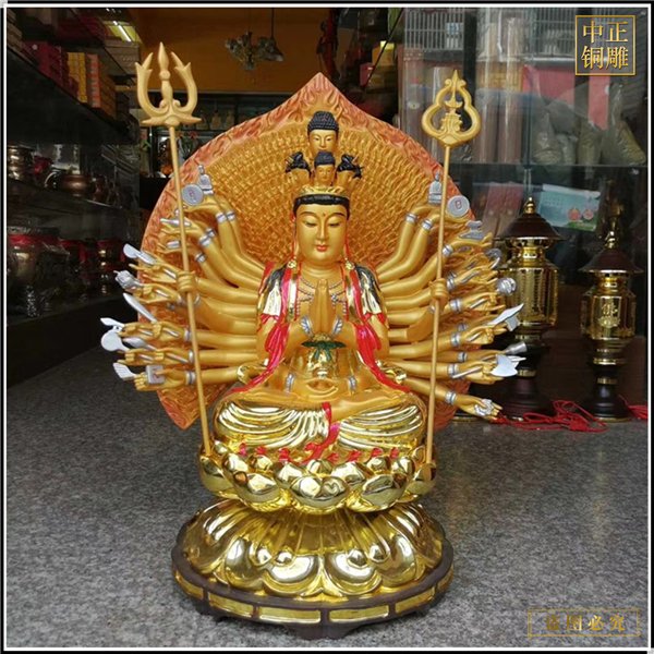 千手觀音又稱千手千眼觀世音、千眼千臂觀世音等,是我國民間信仰的四大菩薩之一。千手千眼銅觀音佛像中觀音千只手如扇面形排列幾層,有如孔雀開屏一般,十分壯觀,而對于千手觀音還有一個美麗的傳說。
