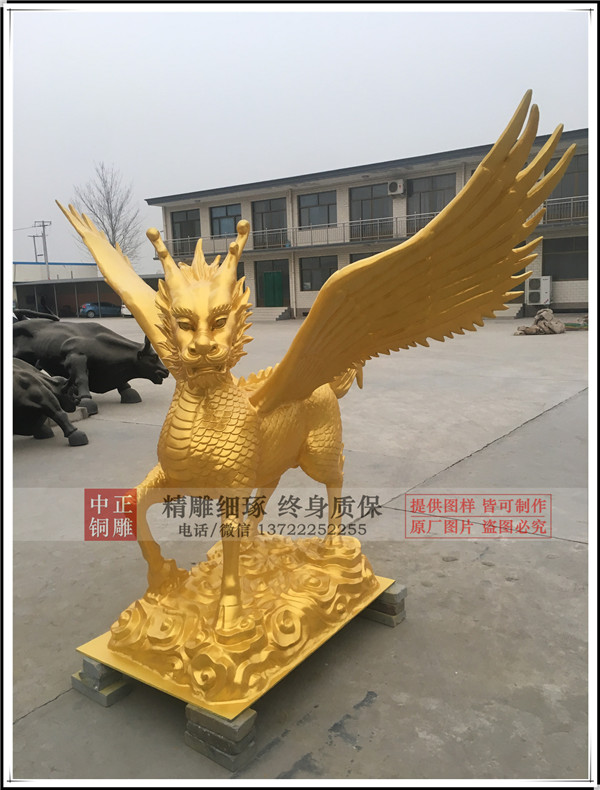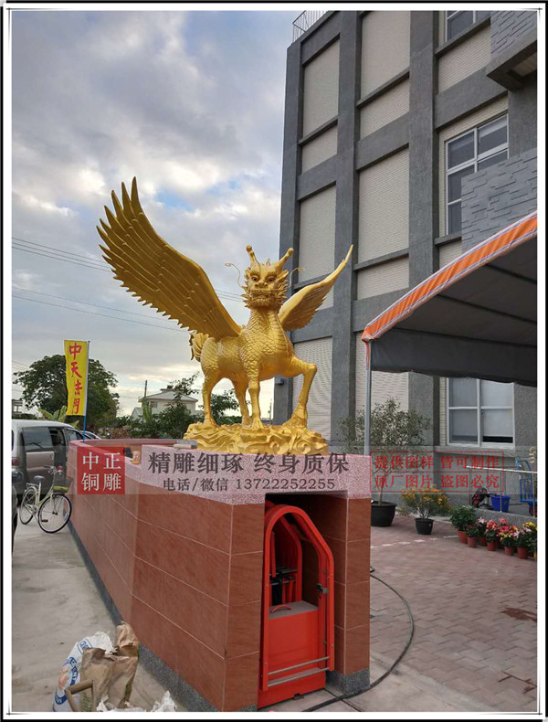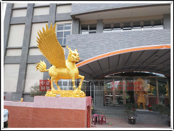 河北唐縣中正銅雕廠生產(chǎn)制作的鑄銅飛天麒麟,麒麟有臺灣客戶設(shè)計(jì)效果圖,我廠制作泥稿,開模,鑄銅。麒麟總高1.75米,底座高0.24米。鑄銅厚度8毫米。表面采用鈦金漆噴漆工藝,表面做氟碳漆保護(hù)。安裝于臺灣苗栗縣中天法門會場大門口。